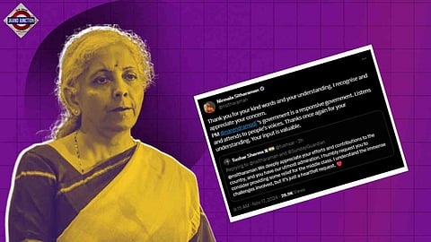 In response, Sitharaman, while appreciating the X user's concerns, described the current government as one that "listens and attends to people’s voices." Addressing the user, she added, "Your input is valuable."