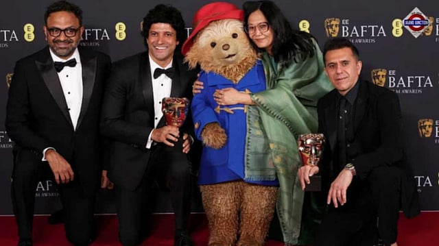 A photograph from the ceremony captured Alan McAlex, Farhan Akhtar, Lakshmipriya Devi and Ritesh Sidhwani posing with the BAFTA trophy for Children’s & Family Film. (AP Photo)