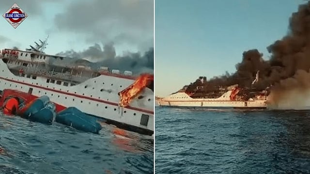 Over 300 people were on board the ferry. In a video, panic-stricken passengers can be seen, some with children seen leaping into the sea to escape the flames.
