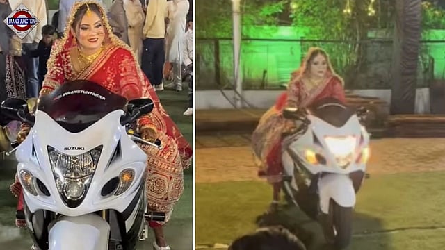 In the now-viral clip, the bride, dressed in a traditional red lehenga, is seen confidently riding the superbike into the wedding venue as guests cheer and capture the moment on their phones.