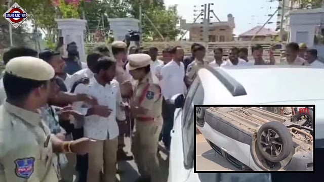 During the chaos, Mahender Reddy’s car was damaged and overturned, while visuals from the spot showed police personnel attempting to control the situation and disperse the crowd.