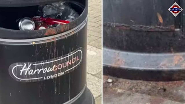 The video shows dustbins, pavements, and roads splattered with deep red marks. Residents of the Rayners Lane district claim that these stains have increased, especially outside stores and eateries that sell paan and chewing tobacco products.