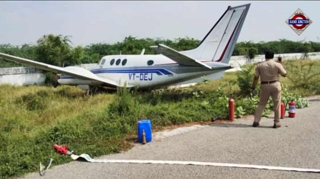 The occupants of the aircraft, top members of a private food processing company, had a narrow escape as the aircraft briefly went out of control and skidded for around 400 metres before coming to a halt.