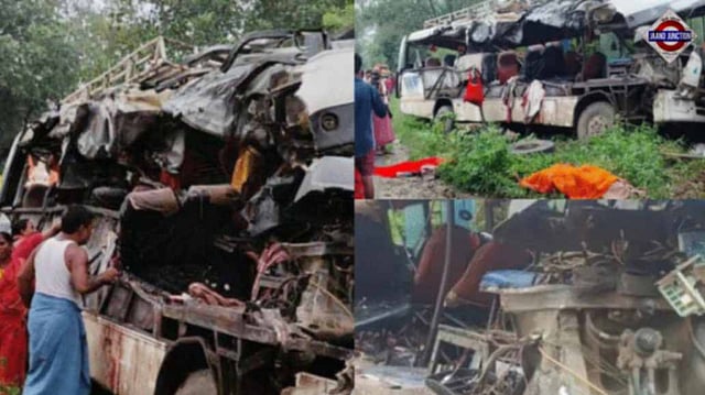 A tragic road accident took place early Tuesday morning in Deoghar district of Jharkhand. A bus carrying Kanwariyas (devotees) crashed into a truck, killing six people and injuring 24 others. The accident happened near Nawakura village, inside the Jamunia forest area, which comes under Mohanpur police station.