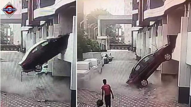 A shocking video of a car falling from the first floor of an apartment's parking complex in Pune has gone viral on social media.