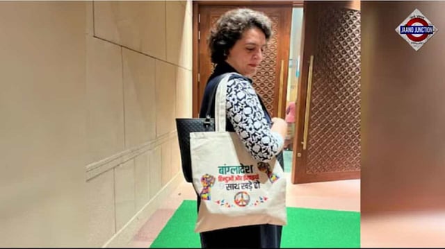 With the ‘Bangladesh’ bag on her shoulder, Priyanka Gandhi was seen leading a protest by Congress MPs against the atrocities committed against Hindus and Christians in Bangladesh on the Parliament premises on Tuesday.