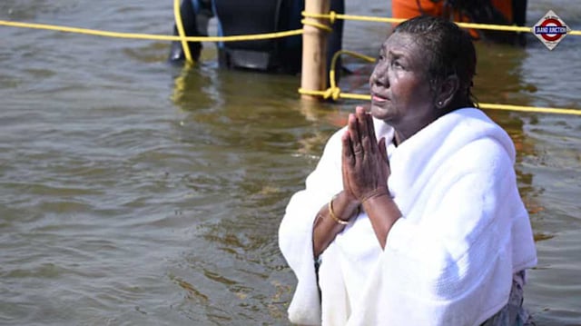 President Droupadi Murmu on Monday took a holy dip at Triveni Sangam during the ongoing Maha Kumbh Mela in Uttar Pradesh's Prayagraj.