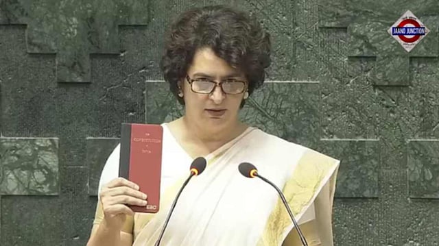 Holding a Constitution book in her hand, 52-year-old Priyanka Gandhi Vadra took oath in the presence of Lok Sabha Speaker Om Birla and MPs seated in Parliament. Her brother Rahul Gandhi, mother Sonia Gandhi, husband Robert Vadra and their children and Congress chief Mallikarjun Kharge were present at the event.