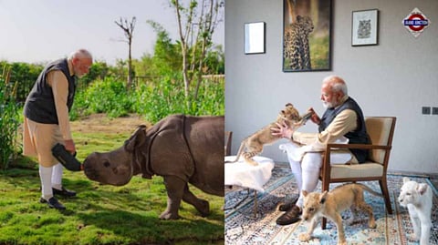 The Prime Minister shared some pictures on X in which he can be seen feeding water to lion cubs and orphaned baby rhinoceros. He was also seen patting an okapi, hugging an orangutan, and spotting crocodiles. The PM also saw a large python, a unique two-headed snake, and a two-headed turtle.